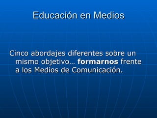 Este documento presenta cinco enfoques para la educación en medios de comunicación: 1) analizar los efectos de la televisión en los niños, 2) explorar los gustos y consumos mediáticos de los jóvenes, 3) un enfoque crítico para comprender cómo los medios representan la sociedad, 4) un análisis semiológico del lenguaje y producción de textos mediáticos, y 5) un análisis de la actualidad basado en noticias. La educación en medios busca enseñar a analizar