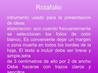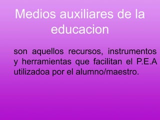 Este documento describe diferentes medios auxiliares de la educación como el rotafolio, proyector, biblioteca, radio, tarea y televisión. Cada medio se describe brevemente en términos de su elaboración, técnica de uso, cuándo es adecuado y cuándo se debe evitar.