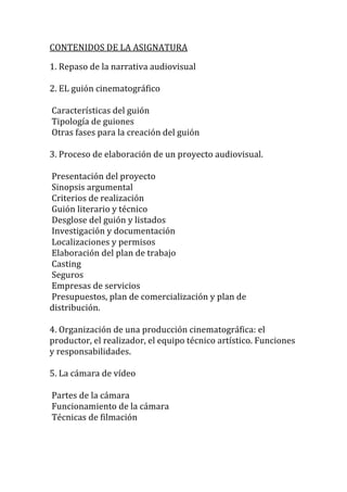 El curso de Medios Audiovisuales para el segundo año se centra en formar a los estudiantes para que interpreten y creen mensajes a través de tecnologías audiovisuales. Se cubrirán contenidos como la narrativa audiovisual, la elaboración de guiones, la producción cinematográfica y la edición de vídeo. La evaluación se basa en la asistencia, trabajos prácticos y un examen final, con criterios claros para la recuperación de trabajos y la justificación de ausencias.