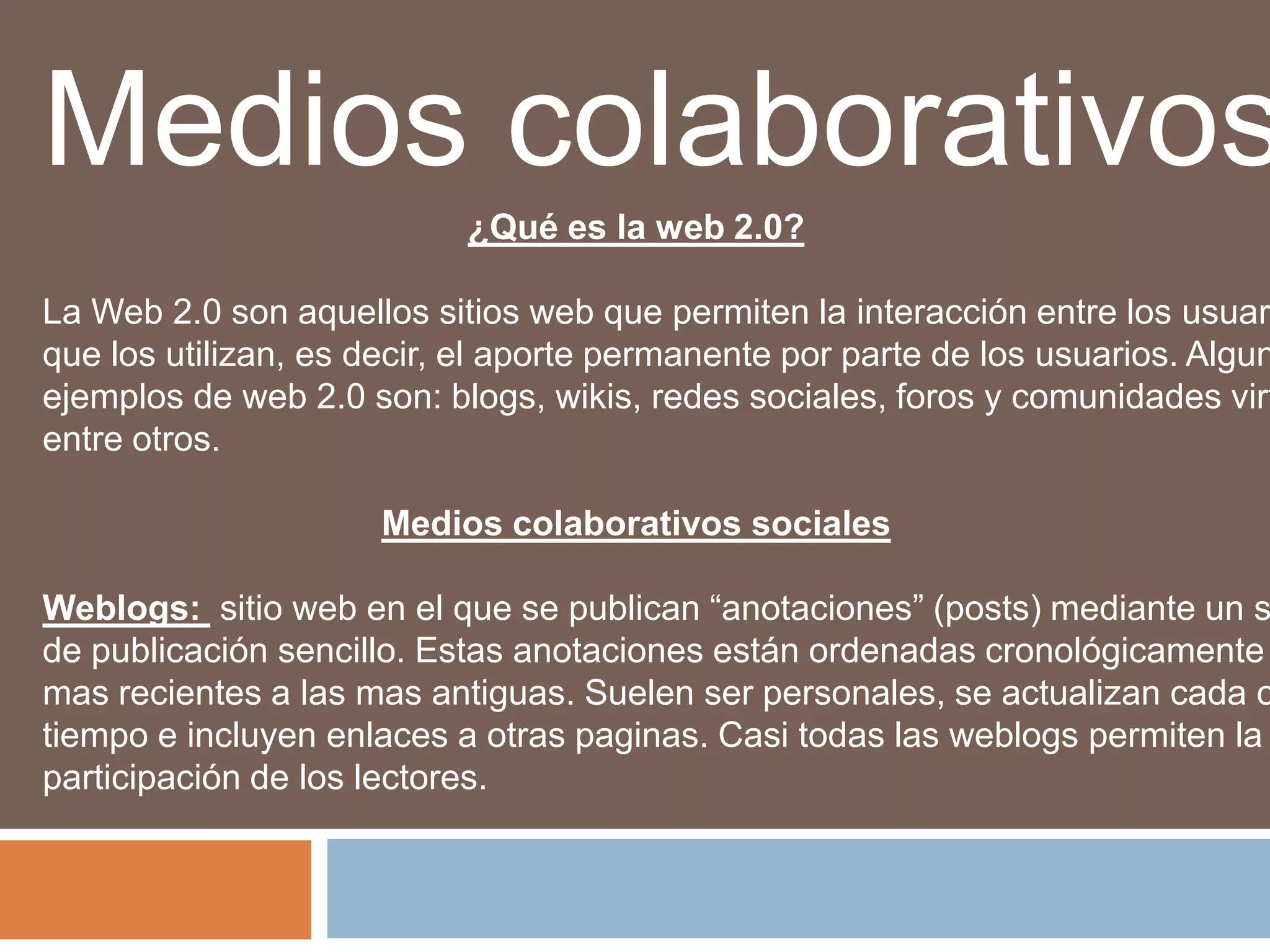 La Web 2.0 permite la interacción entre usuarios a través de blogs, wikis, redes sociales y foros. Los blogs son sitios donde los usuarios publican entradas ordenadas cronológicamente. Las wikis permiten que varios usuarios editen colaborativamente las páginas web. Los EduBlogs apoyan los procesos de aprendizaje. La web colaborativa ofrece mejorar proyectos de forma recíproca, aunque existe el riesgo de robo de datos por falta de seguridad.