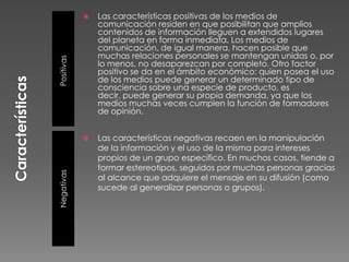 Las características positivas de los medios de comunicación son que permiten que grandes cantidades de información lleguen a muchos lugares rápidamente y ayudan a mantener las relaciones personales. También pueden generar demanda para ciertos productos al influir en la opinión pública. Las características negativas son la manipulación de la información para beneficiar intereses particulares y la tendencia a formar estereotipos dañinos que pueden generalizarse fácilmente debido al alcance de los medios.