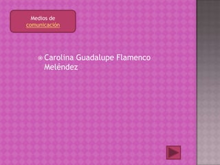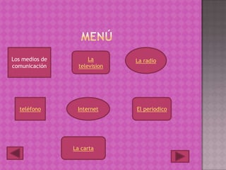 Este documento describe diferentes medios de comunicación como la televisión, la radio, el teléfono, Internet, el periódico y la carta. Explica brevemente cómo funciona cada uno y su importancia. La televisión transmite imágenes y sonido a distancia mediante ondas de radio o cable. La radio transmite señales de audio. El teléfono transmite señales acústicas eléctricamente. Internet es una red mundial de redes interconectadas. El periódico imprime noticias diarias o semanales. Y una carta es un medio