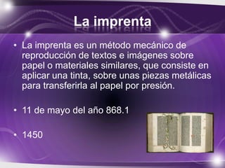 El documento describe las principales herramientas de comunicación humana a través de la historia, incluyendo la imprenta, el telégrafo, el teléfono, la radio y la televisión. Explica brevemente cómo funcionan cada una y algunos detalles clave como sus inventores y fechas de creación, destacando que permitieron un gran avance en la transmisión de información e ideas entre las personas.