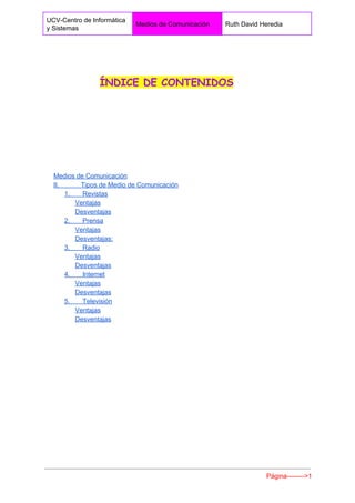 El documento describe los principales tipos de medios de comunicación, incluyendo revistas, prensa, radio, internet y televisión. Para cada medio se enumeran las ventajas y desventajas. Las revistas se especializan en temas específicos pero tienen baja cobertura. La prensa proporciona noticias creíbles pero la lectura es rápida. La radio permite escuchar en movimiento pero solo usa el sentido del oído. Internet permite integrar diferentes formatos pero requiere que el usuario busque la información. La televisión alcan