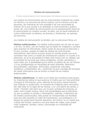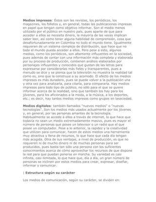El documento describe los diferentes tipos de medios de comunicación, dividiéndolos en categorías como medios audiovisuales, radiofónicos, impresos y digitales. Explica que los medios de comunicación son canales para obtener y expresar información de forma masiva y cómo cada medio tiene sus propias características y ventajas dependiendo de su estructura física. También divide los medios según su carácter en informativos, de entretenimiento, de análisis y especializados.