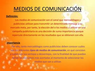 Este documento define los medios de comunicación y explica su importancia para mercadólogos y publicistas. Luego clasifica los medios de comunicación en tres grupos: masivos, auxiliares y alternativos. Describe los principales medios masivos como la televisión, radio, periódicos, revistas, internet y cine, destacando sus ventajas y desventajas para la publicidad. Finalmente, incluye referencias bibliográficas.