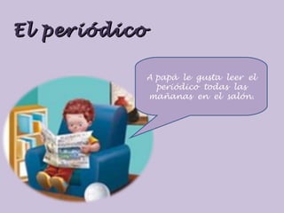 El documento habla sobre las diferentes formas en que una familia usa la tecnología. El padre lee el periódico cada mañana, el niño ve dibujos animados en la televisión después de terminar sus deberes, baila escuchando música en la radio, su abuela lo llama por teléfono para saber cómo le va en la escuela, a los padres les gusta ver noticias en Internet, y a veces van al cine en familia a ver una película.