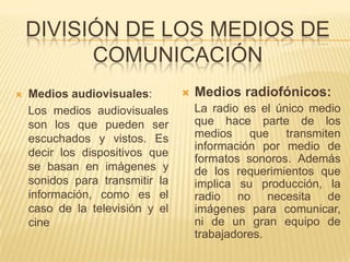 Este documento describe los principales tipos de medios de comunicación, dividiéndolos en cuatro categorías: medios audiovisuales como la televisión y el cine, medios radiofónicos como la radio, medios impresos como periódicos y revistas, y medios digitales como plataformas en internet. Además, los clasifica según su estructura en informativos, de entretenimiento, de análisis, y especializados.