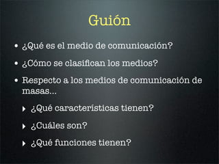 Los medios de comunicación de masas tienen las siguientes características: se dirigen a un público anónimo de forma amplia, el receptor es pasivo sin posibilidad de retroalimentación, y han sido importantes en la formación de opinión. Algunos ejemplos de medios de comunicación de masas son la prensa escrita, la radio, la televisión e Internet. Estos medios cumplen funciones como educar, informar, entretener y formar opinión e influir en los comportamientos.
