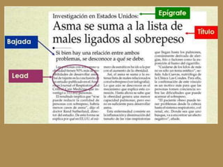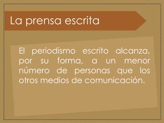 Este documento describe los principales medios de comunicación escrita y sus géneros periodísticos. Explica que la prensa escrita alcanza a menos personas que otros medios. Los géneros periodísticos son informativos, que se basan en noticias y reportajes objetivos, y de opinión, que presentan puntos de vista personales. Luego define reportajes, entrevistas, crónicas y noticias, los géneros informativos principales, describiendo sus características y estructuras.