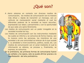 Este documento describe los principales tipos de medios de comunicación, cómo se clasifican y cuáles son sus ventajas y desventajas. Los medios de comunicación se clasifican en medios masivos, auxiliares y alternativos, e incluyen televisión, radio, diarios, revistas, internet, cine, publicidad exterior e interior, y correo directo. Cada medio tiene ventajas como alcance y costo, y desventajas como selectividad y duración de la exposición.
