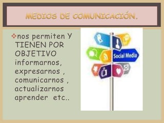 Este documento describe varios medios de comunicación en El Salvador, incluyendo la televisión, redes sociales, celulares, periódicos, radio, revistas y cartas. La televisión es considerado el medio más influyente debido a su capacidad de impacto y alcance. Las redes sociales como Facebook y Twitter permiten que las personas se comuniquen e intercambien información. Los celulares son ampliamente usados aunque también emiten radiación. Los periódicos presentan noticias organizadas en diferentes secciones como deportes y espectáculos