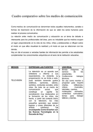 Este documento presenta un cuadro comparativo de los principales medios de comunicación (televisión, radio, cine, prensa y video) y su uso en la educación. Describe cada medio, sus funciones y cómo se utilizan en los centros educativos de una comunidad, encontrando que la televisión y el video son los más usados para apoyar la enseñanza, mientras la prensa es la menos empleada.