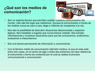 Los medios de comunicación como la prensa, la radio, la televisión, el cine permiten ampliar nuestros conocimientos sobre el mundo más allá de nuestro entorno. Aunque la comunicación a través de los medios no es cara a cara, llegan a millones de personas a la vez mostrando informaciones y situaciones para que las conozcamos y comprendamos. Los medios modifican nuestra percepción de la realidad y nuestra manera de concebir el mundo.