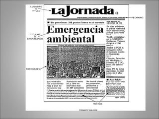 Este documento describe los principales medios de comunicación actuales como periódicos, libros, radio, televisión e internet. Explica los géneros periodísticos informativos como noticias, entrevistas y reportajes, y los géneros de opinión como columnas y editoriales. También resume la estructura típica de un periódico, incluyendo secciones, cabeza, cintillo y otros elementos.