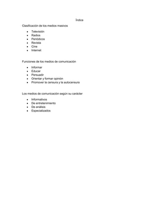 El documento clasifica y describe los principales medios de comunicación masiva como la televisión, radio, periódicos, revistas, cine e internet. Explica que sus funciones incluyen informar, educar, persuadir y formar opinión pública. También distingue entre medios informativos, de entretenimiento y de análisis.