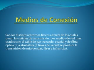 Este documento describe los principales medios de conexión de redes, incluyendo cable de par trenzado, coaxial, fibra óptica y comunicación inalámbrica. Explica que estos medios permiten la transmisión de señales a través de entornos físicos y cada uno tiene características específicas como el tipo de señal que transmiten y la distancia que pueden recorrer.