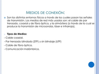Este documento describe los principales medios de conexión de redes, incluyendo cable coaxial, cable par trenzado, cable de fibra óptica y conexión inalámbrica. Explica que estos medios permiten la transmisión de señales entre dispositivos en redes de área local, metropolitana y extensa. Además, proporciona detalles sobre las características y usos típicos de cada uno de estos medios de conexión.