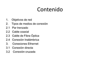 Este documento describe diferentes tipos de medios de conexión para redes, incluyendo par trenzado, cable coaxial, fibra óptica y conexión inalámbrica. También explica conexiones Ethernet directas y cruzadas. Los objetivos generales de una red incluyen compartir información y recursos entre computadoras.