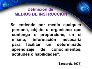 El documento define los medios de instrucción como cualquier persona, objeto u organismo que proporcione información para facilitar el aprendizaje. Explica que los medios reducen el tiempo de aprendizaje, aprovechan las potencialidades sensoriales y mejoran la comprensión y retención. También motivan el aprendizaje y activan funciones intelectuales. Finalmente, categoriza los medios en visuales, auditivos, audiovisuales, multisensoriales, multimedia e hipermedia y proporciona ejemplos de cada categoría.