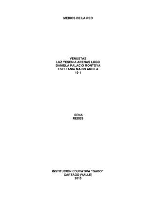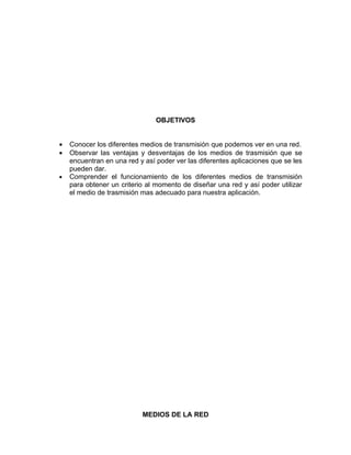 Este documento describe los diferentes medios de transmisión que se pueden encontrar en una red, incluyendo cableado estructurado, cable coaxial, par trenzado y fibra óptica. Explica las características, ventajas y desventajas de cada uno de estos medios, así como factores a considerar al seleccionar un medio para una aplicación específica en una red.