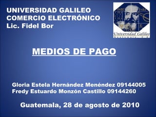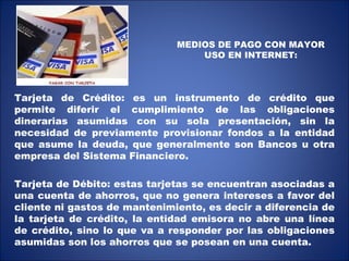 El documento describe varios medios de pago electrónicos populares en Internet, incluyendo tarjetas de crédito, tarjetas de débito, dinero electrónico, tarjetas inteligentes, tarjetas monedero y tarjetas relacionistas. Explica cómo funcionan cada uno de estos medios de pago digitales y también menciona proveedores populares como PayPal y ejemplos como e-checks.