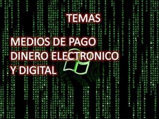Este documento describe diferentes medios de pago electrónicos como tarjetas de crédito, débito, dinero electrónico y tarjetas inteligentes. Explica cómo funcionan cada uno de estos medios y menciona proveedores de pagos electrónicos como PayPal, Daopay y PSBill que facilitan la integración de pagos en línea. También define qué es el dinero electrónico y cómo los usuarios pueden realizar compras en tiendas virtuales utilizando diferentes opciones de pago digital.