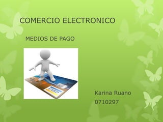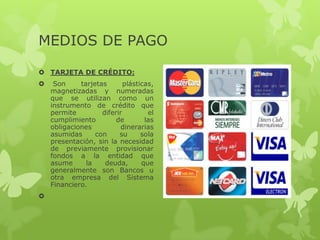 Este documento describe varios medios de pago electrónico, incluyendo tarjetas de crédito, dinero electrónico y pagos en línea. El dinero electrónico se refiere a dinero digital utilizado en transacciones electrónicas a través de medios como pagos en línea. Los proveedores como CyberCash ofrecen carteras digitales que permiten a los usuarios realizar compras en línea de forma segura utilizando tarjetas de crédito u otros medios sin revelar la información de pago al comerciante.