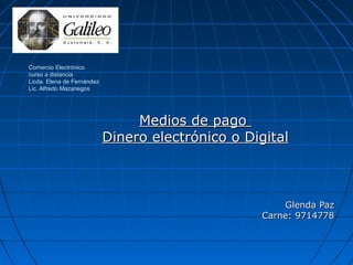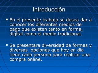 Este documento presenta diferentes medios de pago electrónico para realizar compras en línea, incluyendo tarjetas de crédito, dinero electrónico anónimo e identificado, cheques electrónicos, y plataformas como Credomatic, PayNexus, y 2Checkout. Explica las ventajas y desventajas de cada opción para compradores y vendedores.