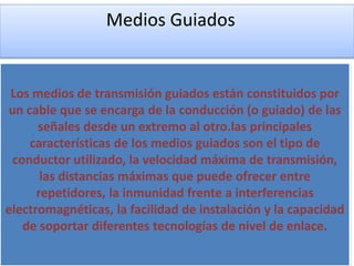 El documento describe los diferentes tipos de medios de transmisión de señales, incluyendo medios guiados como cables de par trenzado, coaxiales y de fibra óptica, así como medios no guiados como la radiotransmisión, microondas, infrarrojos, láseres, satélites y telefonía celular. Explica las características y usos principales de cada uno de estos medios.