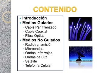 El documento describe diferentes tipos de canales de comunicaciones, clasificándolos en medios guiados y no guiados. Entre los medios guiados se encuentran el cable par trenzado, cable coaxial y fibra óptica. Los medios no guiados incluyen la radiotransmisión, microondas, ondas infrarrojas, satélites y telefonía celular. Se proporcionan detalles sobre las características y aplicaciones de cada uno.