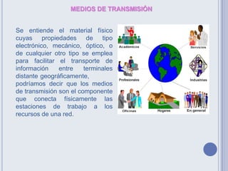 Este documento describe los diferentes medios de transmisión utilizados en las redes locales, incluyendo medios guiados como cables de par trenzado, coaxiales y de fibra óptica, y medios no guiados como la radiotransmisión, microondas, ondas infrarrojas, transmisión láser, satélite y telefonía celular. Explica las ventajas y desventajas de cada uno de estos medios, así como sus usos y limitaciones comunes. El documento proporciona información técnica fundamental sobre cómo se transmiten los datos a través de