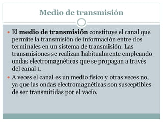 Este documento describe los diferentes tipos de medios de transmisión, incluyendo medios guiados como cables de par trenzado y coaxial, y medios no guiados como ondas electromagnéticas. Explica que los medios guiados conducen señales a través de un cable, mientras que los no guiados usan ondas electromagnéticas. También clasifica los medios por su forma de transmisión, sentido de transmisión y rango de frecuencias.