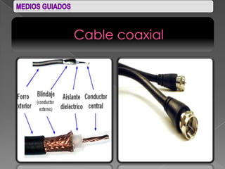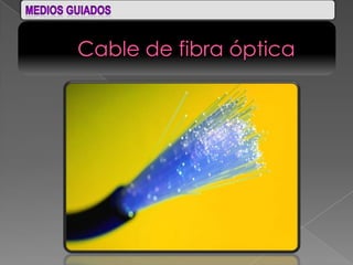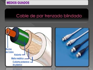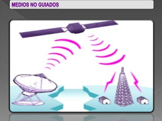 Este documento describe diferentes tipos de medios de comunicación para redes locales, incluyendo medios guiados (cable de par trenzado, cable coaxial, fibra óptica) y medios no guiados (radiotransmisión, microondas, infrarrojos, láseres, satélites, telefonía celular). Explica las ventajas y desventajas de cada medio, así como sus usos comunes en redes de comunicación.