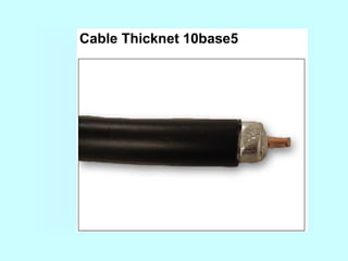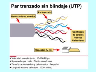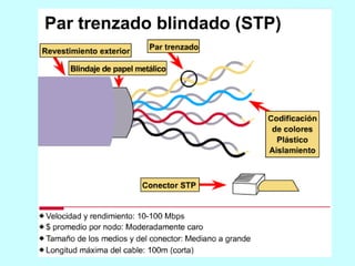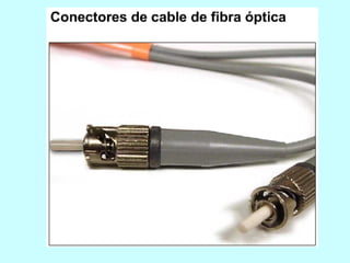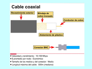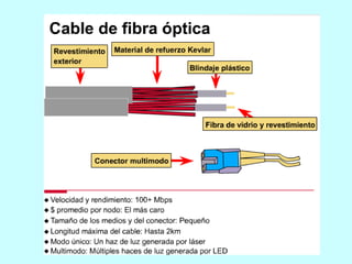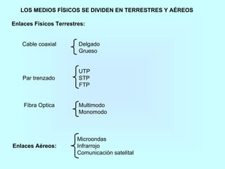 Este documento describe diferentes medios físicos de transmisión de datos, incluyendo cables coaxiales, de pares trenzados, fibra óptica y enlaces inalámbricos. Explica las características clave de cada medio como su ancho de banda, atenuación y resistencia al ruido. También cubre conceptos como las categorías de cable UTP y las pérdidas en fibra óptica debido a factores intrínsecos y extrínsecos.