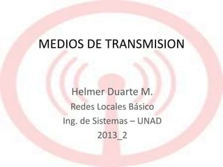 Este documento describe los diferentes medios de transmisión, incluyendo medios guiados como cable de par trenzado, cable coaxial y fibra óptica, y medios no guiados como radio transmisión, transmisión por satélite y ondas infrarrojas. Explica las características y ventajas y desventajas de cada medio.