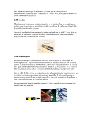 El documento describe los principales medios de transmisión utilizados en las redes, incluyendo cable de par trenzado, cable coaxial, cable de fibra óptica y transmisión inalámbrica. Explica que el cable de par trenzado, cable coaxial y cable de fibra óptica son los medios más comúnmente utilizados en las redes actuales, aunque la transmisión inalámbrica también se usa a pesar de ser más lenta.