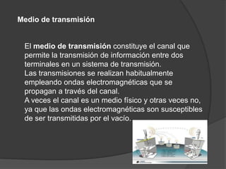 Los medios de transmisión permiten la transmisión de información entre dos terminales y pueden ser guiados u no guiados. Los medios guiados utilizan cables como el par trenzado o el cable coaxial, mientras que los no guiados usan ondas electromagnéticas transmitidas a través del aire por antenas. Los medios también se clasifican según su sentido de transmisión: simplex, half-duplex o full-duplex.