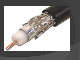 El documento describe diferentes tipos de medios de transmisión de datos, incluyendo cables de par trenzado, coaxiales y de fibra óptica, así como medios inalámbricos como microondas terrestres y satelitales. Explica las características y componentes de cada medio, como sus ventajas e inconvenientes para la transmisión de datos.
