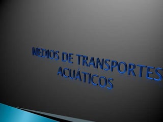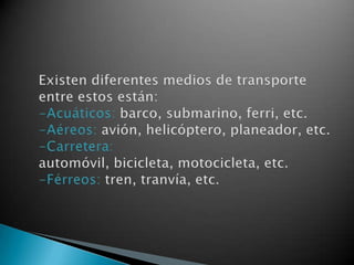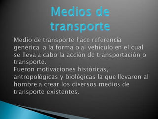El documento describe la invención y desarrollo de varios medios de transporte a través de la historia, incluyendo el barco, submarino, ferry, kayak, avión, helicóptero, planeador, automóvil, bicicleta, motocicleta, tren y tranvía. Proporciona detalles sobre quiénes inventaron cada uno y aproximadamente cuándo ocurrió.