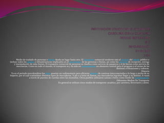 El transporte se define como el traslado de personas o bienes de un lugar a otro. Incluye medios como el transporte terrestre (carretera, ferrocarril), marítimo, y aéreo. Cada modo de transporte ha evolucionado históricamente para servir las necesidades de movilización de las personas y mercancías de manera más eficiente. El transporte ha sido fundamental para el progreso de las civilizaciones y el intercambio entre culturas a lo largo de la historia.