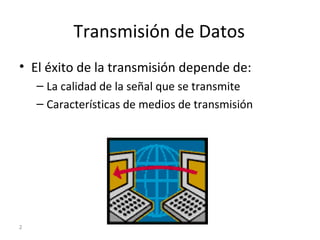El documento describe diferentes medios de transmisión de datos, incluyendo medios guiados como cables de par trenzado, coaxiales y de fibra óptica, así como medios no guiados como el aire, el vacío y microondas. Explica las características, ventajas e inconvenientes de cada medio y cómo se clasifican dependiendo de si guían o no la señal a lo largo de un camino físico.