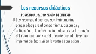 Este documento describe los recursos didácticos y su evolución. Define los recursos didácticos como medios utilizados por los docentes para apoyar el aprendizaje. Explica que los recursos incluyen una variedad de técnicas e instrumentos como pizarras y videos. También clasifica los recursos en materiales impresos y digitales e identifica ejemplos como libros, computadoras e Internet.
