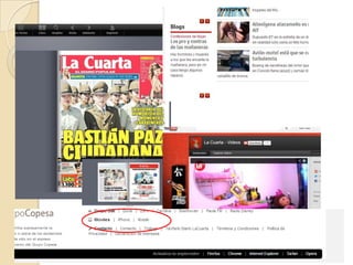 El documento evalúa y puntúa tres medios digitales chilenos y uno español según sus elementos multimedia, interactivos y de participación. Se analizan sitios como La Voz de Valparaíso, La Cuarta, El Popular y Que, asignando puntos de acuerdo a la presencia de blogs, redes sociales, versiones móviles y otras características. La Cuarta obtiene la mayor puntación total, seguida de Que, mientras que El Popular puntúa más bajo.