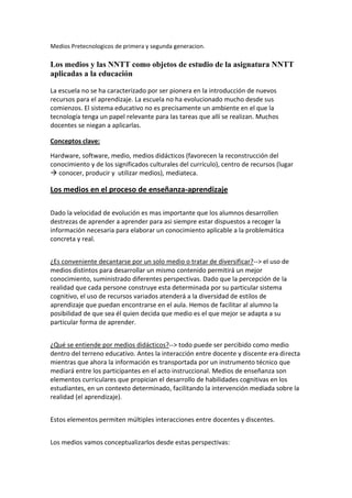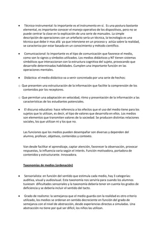 El documento discute los medios de enseñanza pretecnológicos y de primera y segunda generación, y proporciona taxonomías y criterios para la selección, diseño y evaluación de medios didácticos. Se describe el papel del centro de recursos para apoyar a los profesores y estudiantes y compartir recursos entre escuelas.