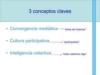 El documento discute la cultura de la convergencia mediática, que implica que los viejos y nuevos medios interactúan y permiten que todos produzcan y compartan información. Esto representa una oportunidad para los conglomerados mediáticos pero también un riesgo de fragmentación del mercado. Además, cambia la relación entre los medios y el público del consumo individual al consumo colaborativo en red.