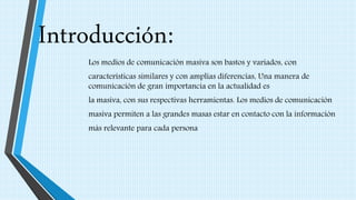Este documento describe los principales medios de comunicación masiva como los libros, la prensa, las revistas, la radio, el cine, la televisión, Internet y sus funciones. Define los medios de comunicación masivos como aquellos que permiten transmitir información de manera simultánea a una gran audiencia y menciona que su función principal es comunicar e informar, pero también entretener y enseñar a la población.