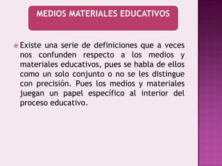 Los medios y materiales educativos se refieren a cualquier objeto, recurso o experiencia que se utiliza en el proceso de enseñanza-aprendizaje e implican tanto la organización didáctica del mensaje como el equipo técnico necesario. Existen diferentes tipos de materiales como los auditivos, visuales, impresos y electrónicos. La producción de materiales educativos implica varias etapas como el diseño, desarrollo, revisión, producción experimental y evaluación para garantizar que cumplen con los objetivos de aprendizaje.