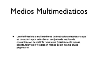 Un multimedios es una empresa que controla varios medios de comunicación como prensa, televisión y radio. Si bien se critica que puede concentrar demasiado poder e influencia en pocas manos, también se argumenta que permite llegar a más personas y optimizar los costos publicitarios.