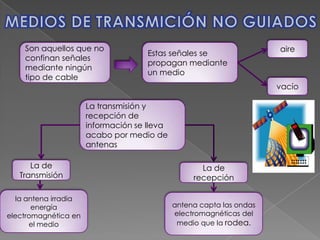 Este documento describe los diferentes tipos de medios de transmisión no guiados como la radio, microondas e infrarrojos. Explica que las señales de radio pueden recorrer grandes distancias pero están sujetas a interferencias, mientras que las microondas viajan en línea recta entre emisor y receptor alineados a distancias menores de 80 km. También describe las aplicaciones del microondas terrestre y satelital para telefonía, datos y televisión, así como sus ventajas y desventajas.